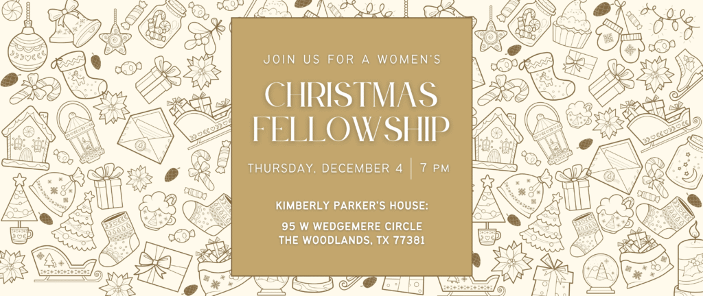 Women’s Christmas Fellowship Yesterday Danielle Carmichael Announcements Ladies, join us at Kimberly Parker’s house on Thursday, December 4, at 7pm for our Women’s Christmas Fellowship! Her address is 95 W Wedgemere Circle, The Woodlands, TX 77381.